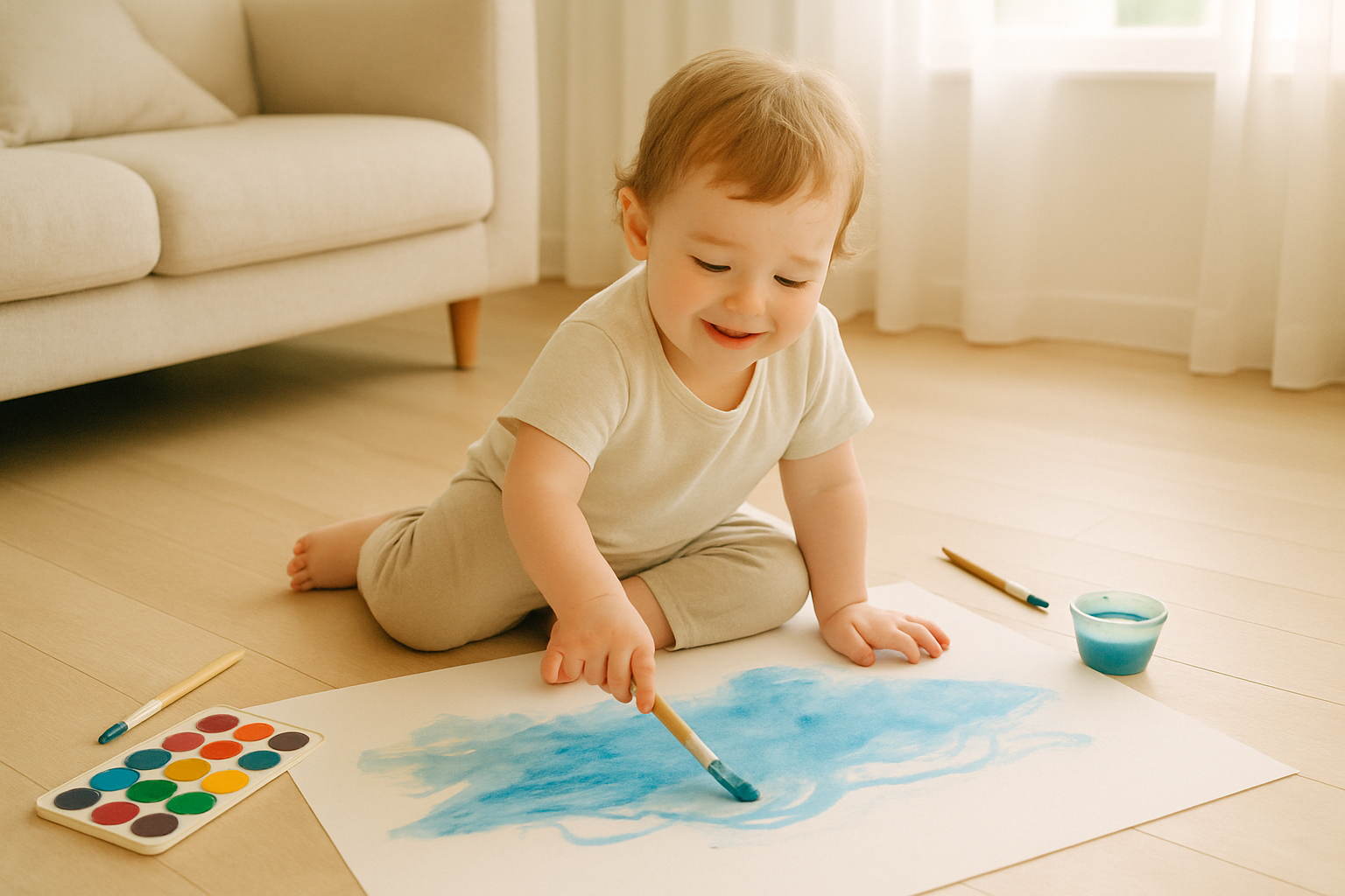 작은 손에 파란 물감을 묻히고,